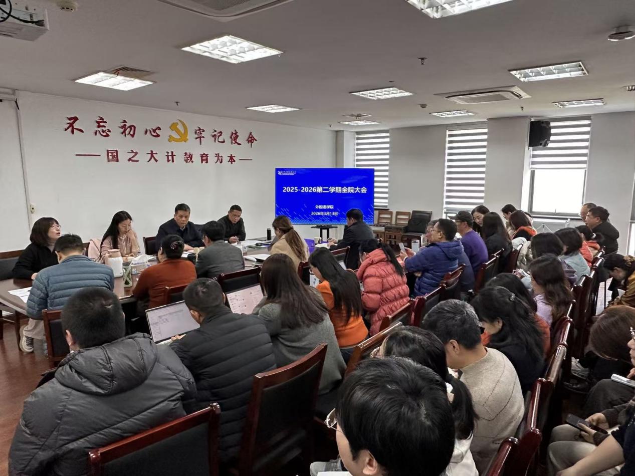 3月13日下午,外国语学院在行政楼1508室召开新学期全院教职工大会,全面复盘2025年工作成效,部署2026年重点任务。