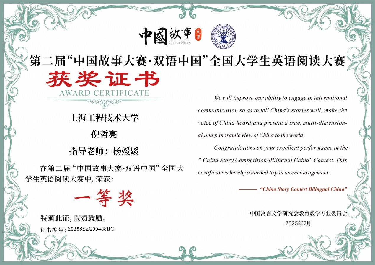 Student from Our School Won the First Honor Award in the “China Story Competition-Bilingual China” Contest