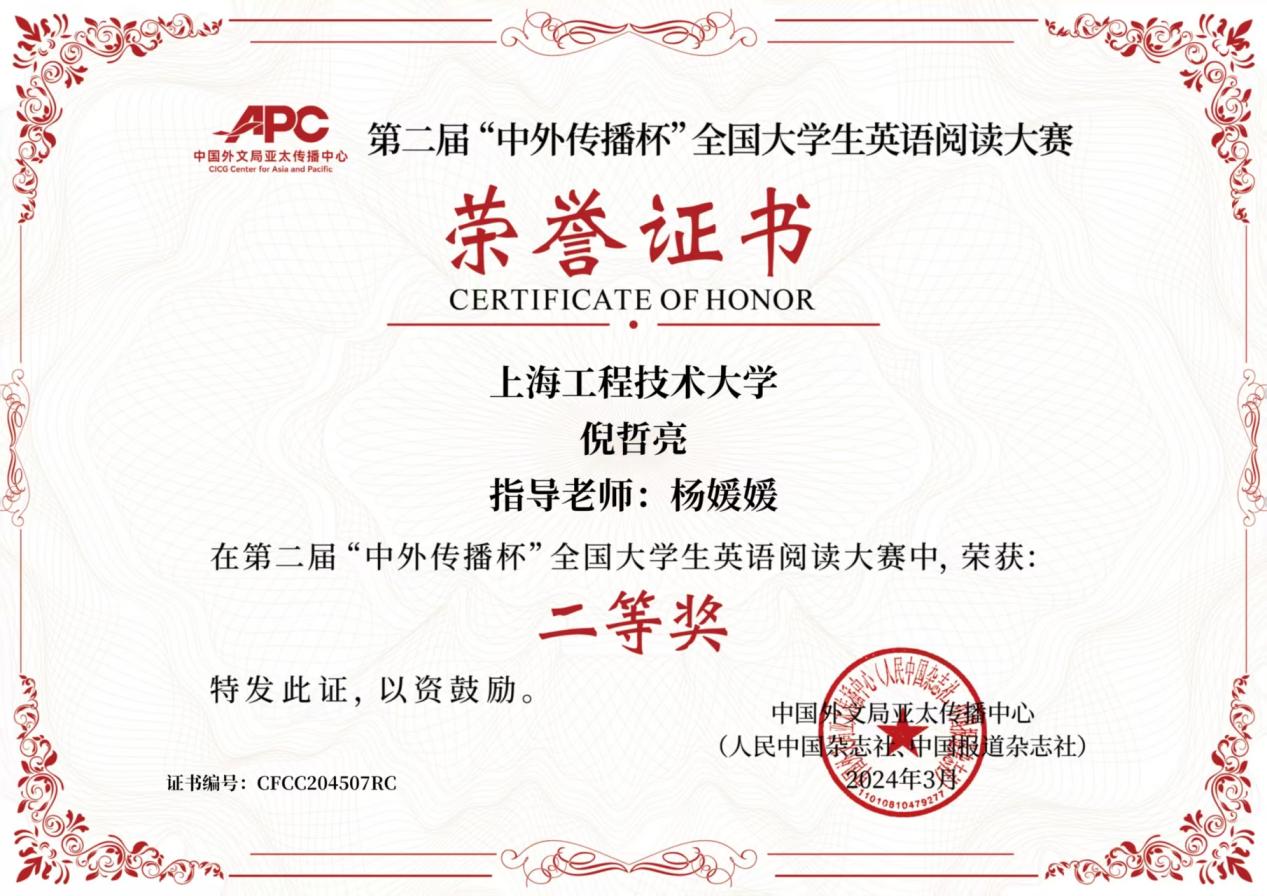 Student from Our School Won the Second Prize in the Second "China-Foreign Communication Cup" National College Students English Reading Competition.