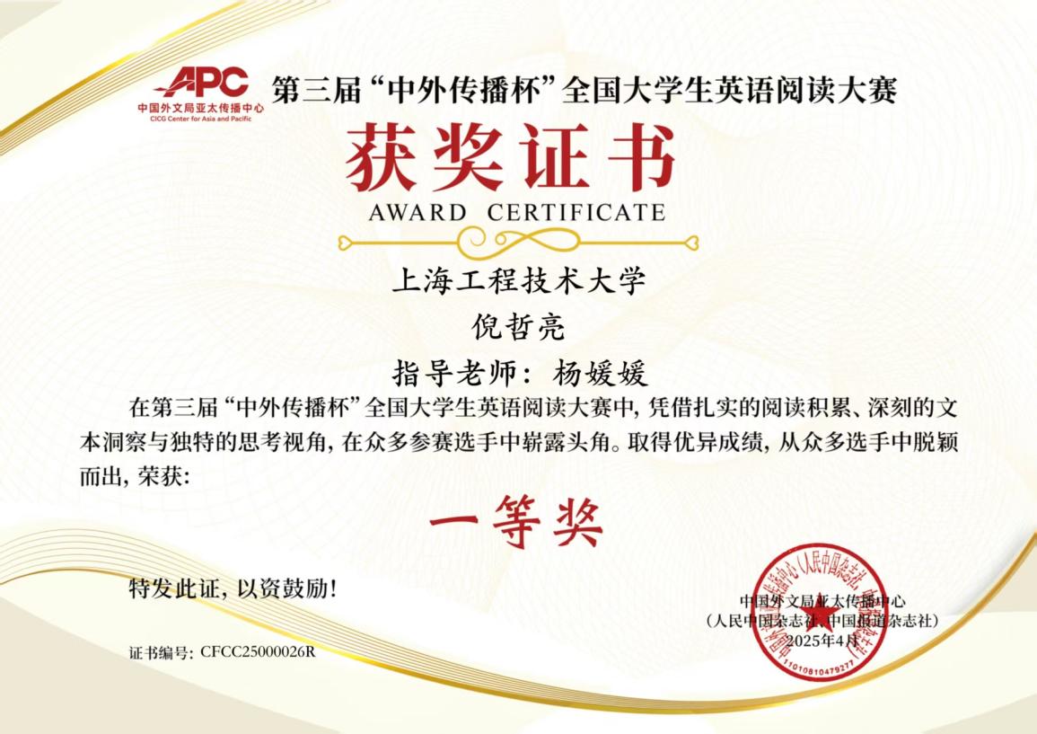 Student from Our School Won the First Prize in the Third "China-Foreign Communication Cup" National College Students English Reading Competition.